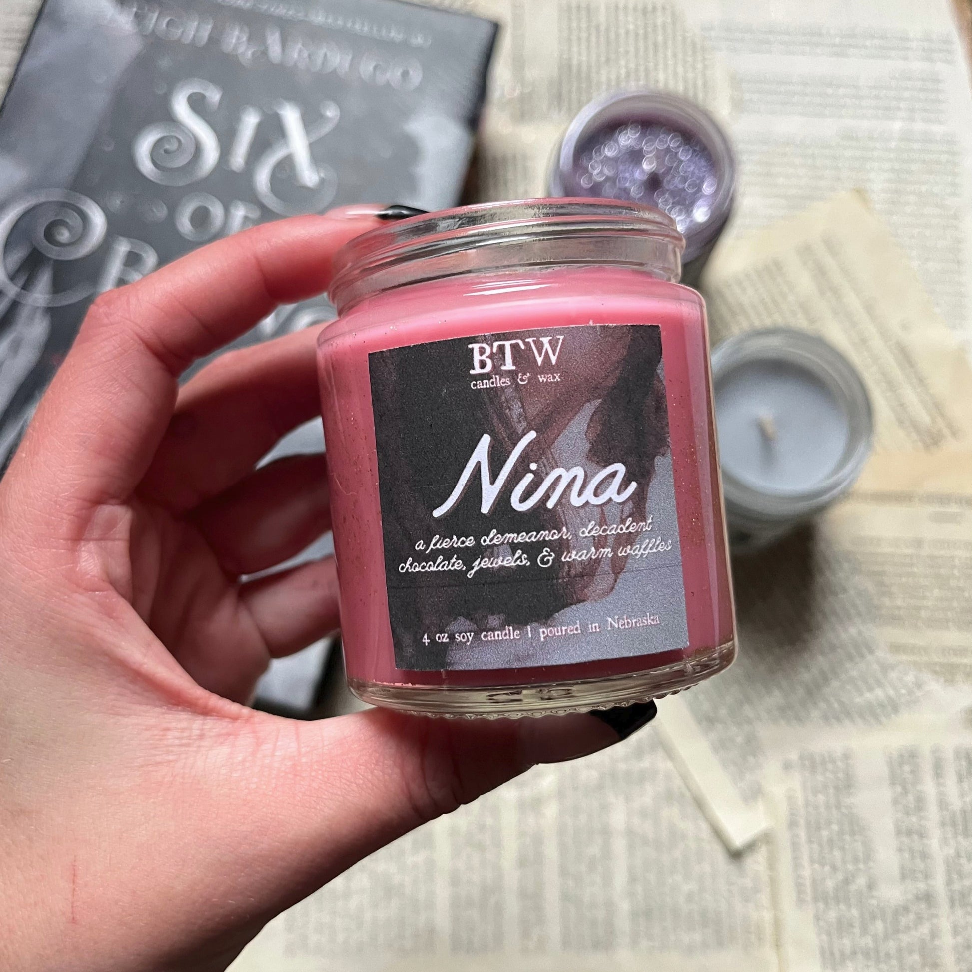 This candle is a bright representation of her captivating personality; it has a scarlet red base and shimmery gold glitter. Now the scent is absolutely to die for, literally it's so good. The Nina candle is a blend of delicious, juicy chocolate covered strawberries and freshly baked waffles covered in sweet sugar and lots of syrup.